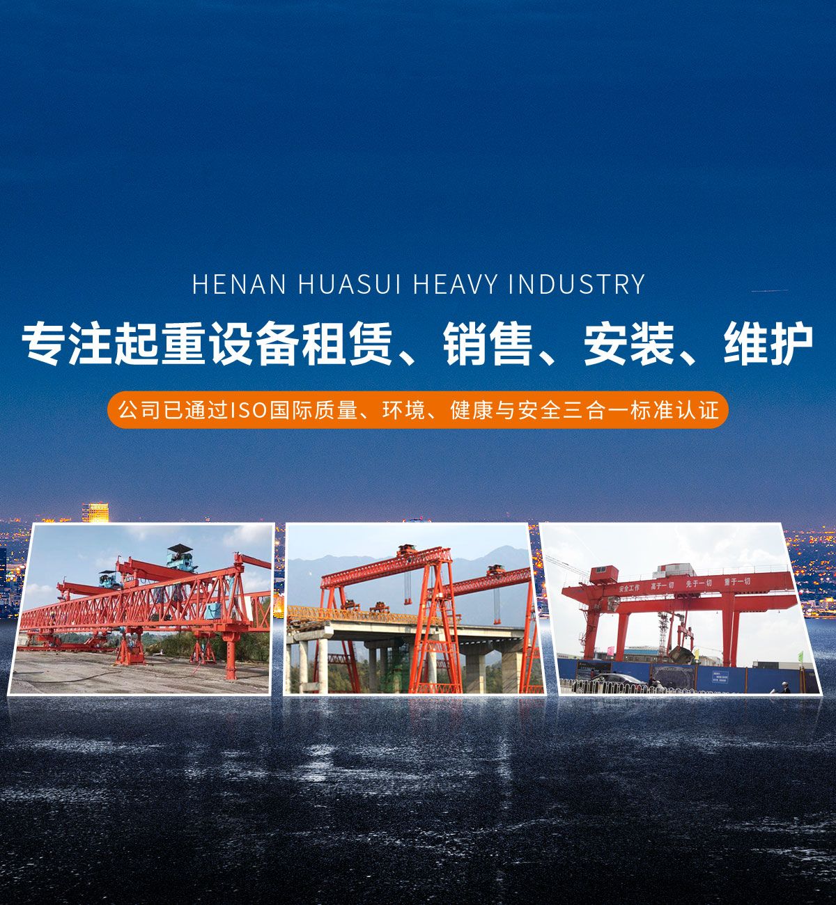 河南華隧重工機械裝備有限公司主要從事通用門式起重機、橋式起重機、電動單梁起重機,輪胎式起重機、架橋機、提梁機、遠梁平車、鋼絲繩電動萌蘆、卷揚機、起重配件制造、銷售:起重機械租賃、安裝和維修,起重設備園收,機械設備維修,鋼結構工程承包,橋梁工程及技術咨淘服務,銷售五金制品、機電設備:建設工程監理,建設工程設計,各類工程建設活動,建筑勞務分包,建筑物折除作業,施工作業,工程管理服務,土石方工程施工,裝如發運。  公司已通過IS0國際質量、環境、健康與安全三合一標準認證,特種設備制造許可證和特種設備安裝改造維修許可證。擁有完熟的質量管理體系。嚴格的管理制度,強大的生產能力和先進的檢測手段,在保證產品質量的同時,也具備了極強的市場競爭力?! 」緢猿挚萍紕撔聻槔砟?,產品質量為核心,注重信譽,建立了減信可靠、快捷、思速。便利周到的售后服務網絡?! ∥覀儞碛械募夹g專家和技術服務隊伍為客戶提供充善的售前技術支持和全天候的售后服務體系,讓您無后顧之憂,享受一站式的超值服務?!  叭A隧重工,伴您成功“是華隧重工永遠的宗指,真被的希望與各界朋友攜手并進。共創輝準!